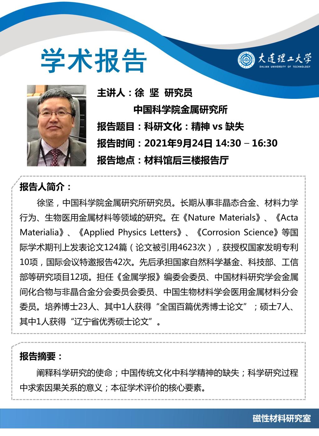 徐坚,中国科学院金属研究所研究员。长期从事非晶态合金、材料力学行为、生物医用金属材料等领域的研究。在《Nature Materials》、《Acta Materialia》、《Applied Physics Letters》、《Corrosion Science》等国际学术期刊上发表论文124篇 (论文被引用4623次),获授权国家发明专利10项,国际会议特邀报告42次。先后承拍国家自然科学基金、科技部、工信部等研究项目12项。担任《金属学报》编委会委员、中国材料研究学会金属间化合物与非晶合金分会委员会委员中国生物材料学会医用金属材料分会委员。培养博士23人、其中1人获得“全国百篇优秀博士论文”;硕士7人、其中1人获得“辽宁省优秀硕士论文”。
