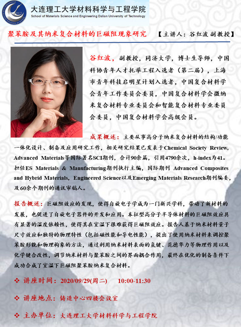 谷红波副教授,同济大学,博士生导师,中国科协青年人才托举工程入选者(第二届),上海市青年科技启明星计划入选者,中国复合材料学会青年工作委员会委员,中国复合材料学会微纳米复合材料专业委员会和智能复合材料专业委员会委员,中国复合材料学会高级会员。成果概述:主要从事高分子纳米复合材料的结构/功能一体化设计、制备及应用研究工作,相关研究结果已发表于Chemical Society Review,Advanced Materials等国际著名SCI期刊,合计90余篇,引用4790余次,h-index为41。担任ES Materials & Manufacturing期刊执行主编,国际期刊 Advanced Composites and Hybrid Materials, Engineered Science以及Emerging Materials Research期刊编委,及60余个期刊的通讯审稿人。