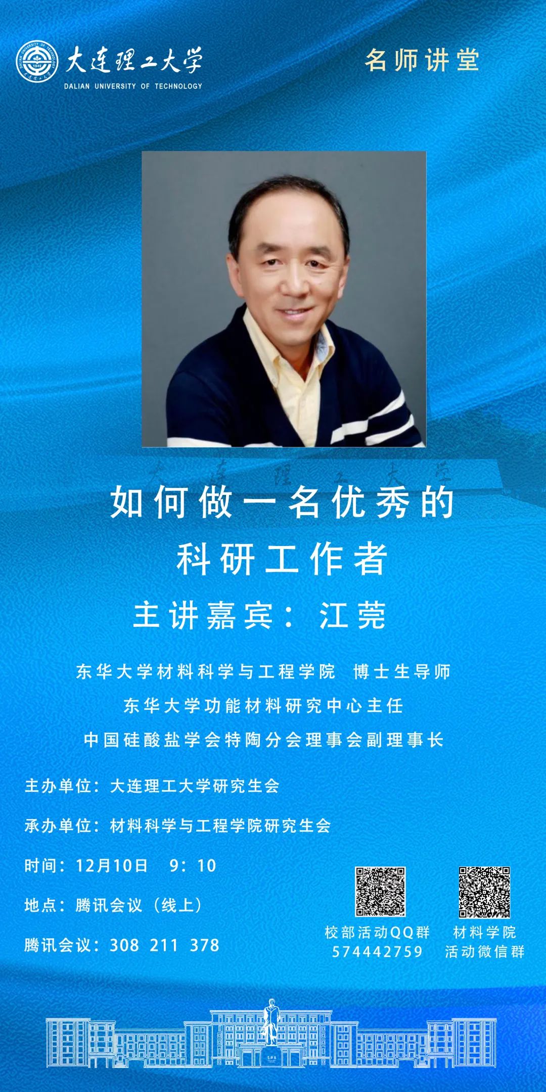 本次讲座邀请到国家杰出青年科学基金获得者,东华大学材料科学与工程学院无机非金属材料系博士生导师,东华大学功能材料研究中心主任江莞教授。江莞教授以所在团队为范例,浅谈年轻教师成长和研究生培养过程中的一些感受和体会。在高校科研工作中取得的每一个成果都和研究生的奉献密不可分,研究生培养是一个相辅相成的过程,研究生在学习科学研究的过程中得到知识的积累和能力的提升,而导师在研究生取得成果的助力下得到成长。