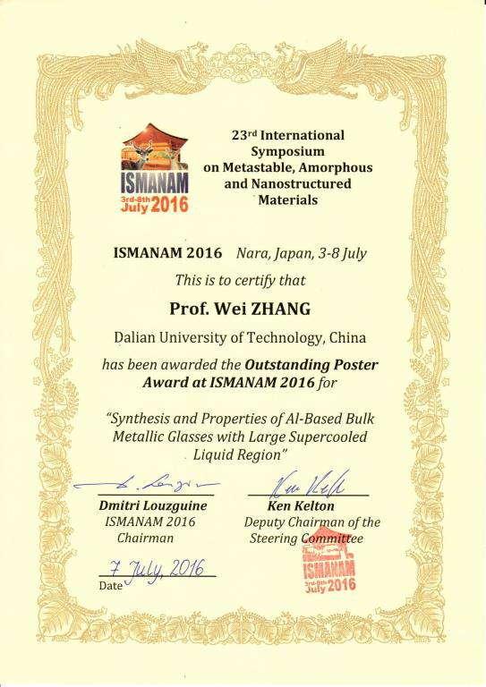 在海报展示环节,张伟教授课题组共发表了2篇会议海报,1篇为《Synthesis and properties of Al-based bulk metallic glasses with large supercooled liquid region》(陈思泉、张伟、朱正旺、李艳辉等),另1篇为《Novel soft magnetic Fe-Co-Ni-M high-entropy bulk metallic glasses》(李艳辉、张伟、齐天龙等)。这些研究工作得到了参会专家和学者的关注和好评。其中,第1篇关于Al基金属玻璃工作的海报荣获了本届会议“最佳海报奖”。