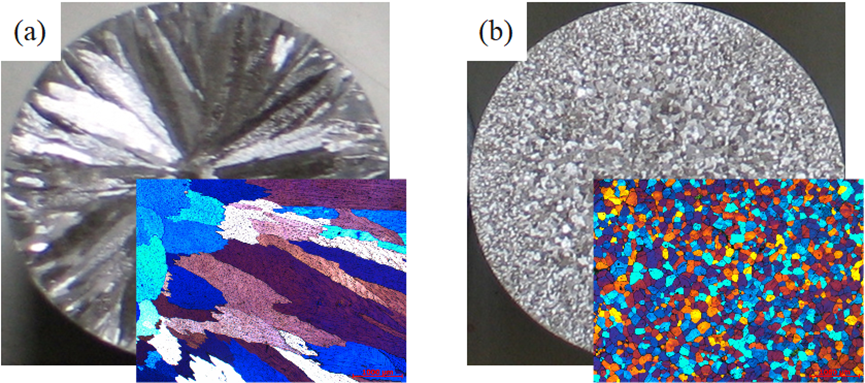 图2瓷刚铝的晶粒组织(a)工业纯铝的晶粒组织(柱状晶);(b)瓷刚铝母材的晶粒组织(等轴晶)
