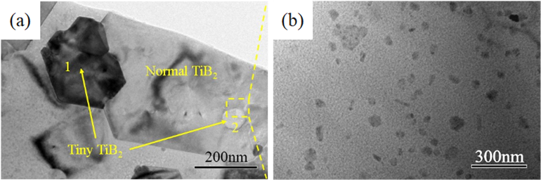图3瓷刚铝母材中的纳米TiB2颗粒(a)传统氟盐工艺制备的Al-Ti-B(微米级颗粒);(b)瓷刚铝母材(纳米级颗粒)
