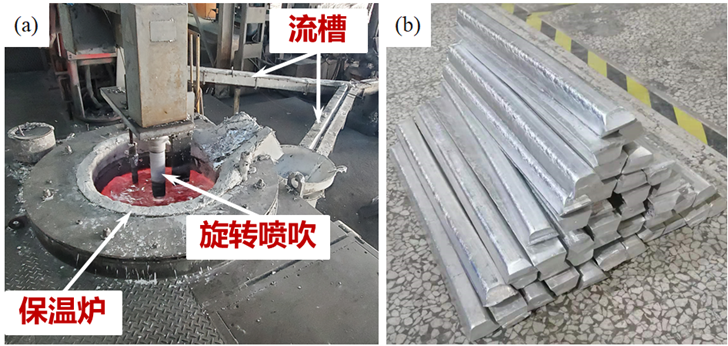 图1瓷刚铝母材制备过程及产品外观(a)瓷刚铝母材生产现场;(b)瓷刚铝母材梯形连铸锭外观