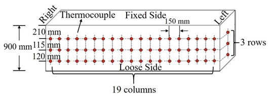 黏结漏钢发生时,发生黏结处的铜板局部温度会迅速升高。因此通过在铜板上安插一定数量的热电偶来实时监测铜板表面的温度。如下图所示为结晶器表面热电偶布置示意图,结晶器由四块铜板组合而成,铜板高度为900 mm,浇铸时的有效高度为800 mm。在结晶器内、外弧宽面铜板上各布置3排19列热电偶,左、右侧窄面铜板上各布置3排1列热电偶,共120支热电偶。其中,3排热电偶距结晶器上口的距离分别为210 mm、325 mm和445 mm,宽面铜板相邻两列热电偶的间距为150 mm。