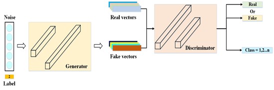下图所示为ACWGAN-GP模型架构图,Label为样本集P中所包含的类别标签。Noise为服从高斯分布的噪声向量。Fake vectors为生成器Generator生成的伪样本,与真实样本Real vectors共同输入到判别器Discriminator中。判别器对上述样本进行真伪鉴别并输出其对应的类别。