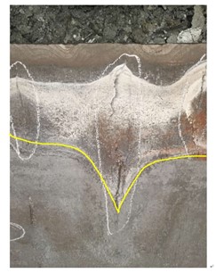 浇铸过程中随着铸坯的下移,黏结区域会沿浇铸方向纵向扩展。同时,结晶器的上下振动会导致黏结处的坯壳出现反复的撕裂和愈合,黏结会沿铸坯宽度方向横向扩展。纵向扩展和横向扩展即为黏结漏钢特有的二维空间传播特征,最终在铸坯表面形成“V”型撕裂口。因此,黏结在铸坯表面扩展形成的“V”型特征区域是判断和识别黏结漏钢的重要依据。针对这一特征,同时借助近年来快速发展和应用广泛的计算机视觉技术对结晶器铜板温度进行可视化处理,从时间和空间角度提取黏结区域的几何和移动特征,构造可表征黏结漏钢“V”型区域的特征向量。如下图所示为铜板表面V型区域实物图和模拟热像图。在此基础上,利用深度学习中的生成对抗网络模型,对真伪黏结特征向量样本进行分类训练和测试,建立了基于计算机视觉和生成对抗网络的漏钢预报方法,为连铸过程异常监控提供了新思路。