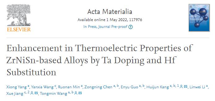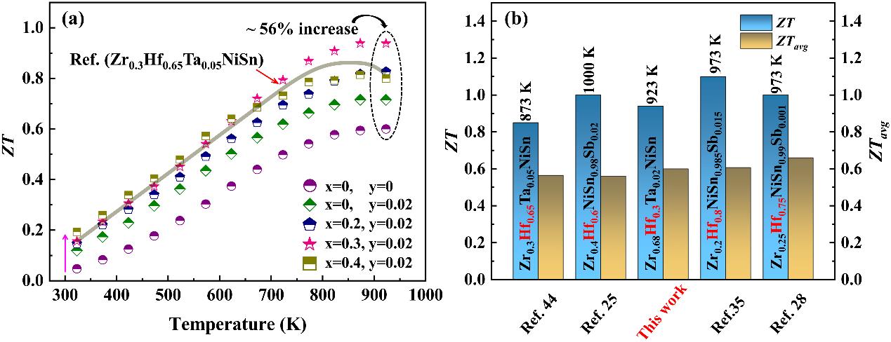 在此基础上,近日该团队在Zr位置进行同族Hf替代,引入点缺陷散射源进一步降低晶格热导率,最终制备出Ta掺杂和Hf替代的ZrNiSn基HH块体合金,ZT在923K高达0.94,增加了约56%。相关成果以“Enhancement in Thermoelectric Properties of ZrNiSn-based Alloys by Ta Doping and Hf Substitution”为题发表在金属材料领域顶级TOP1期刊Acta Materialia上(DOI: /10.1016/j.actamat.2022.117976)。