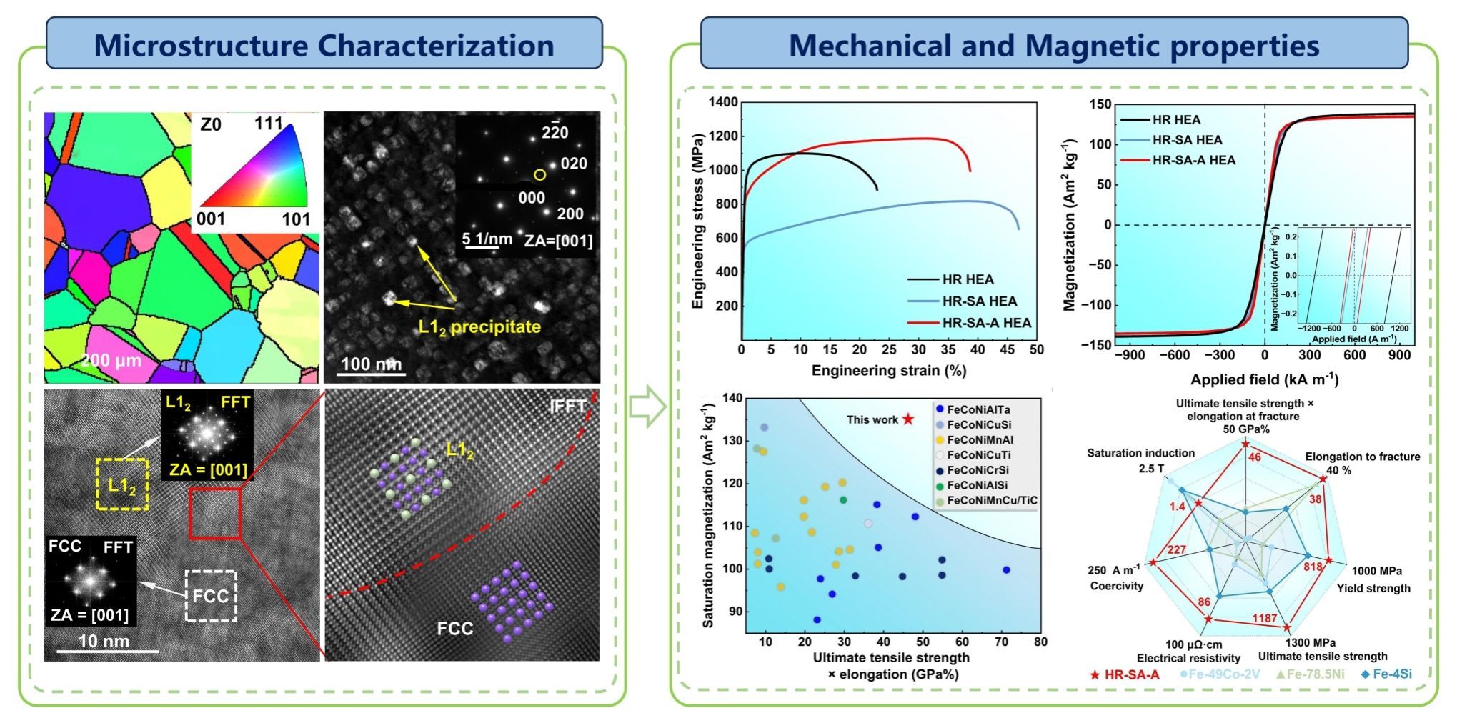 近日,材料科学与工程学院卢一平教授团队在软磁高熵合金研究领域取得突破性成果。该研究针对传统软磁材料力学性能与软磁性能相互矛盾的问题,基于高熵合金的设计思想,创新性地提出了负混合焓设计策略,成功开发出兼具高饱和磁化强度、高强度与高塑性的新型软磁高熵合金。研究成果以“负混合焓路径指导设计具有高饱和磁化强度的高强韧软磁高熵合金”(Negative mixing enthalpy route guides strong and ductile soft magnetic high-entropy alloys with high saturation magnetization)为题,发表在材料科学领域顶级期刊《今日材料》(Materials Today)上。