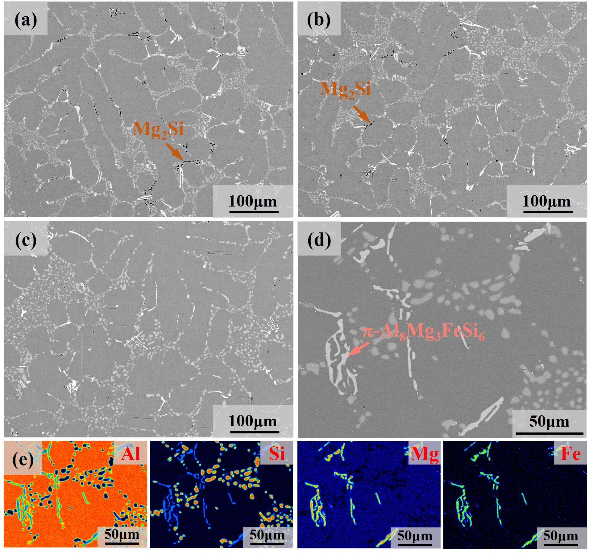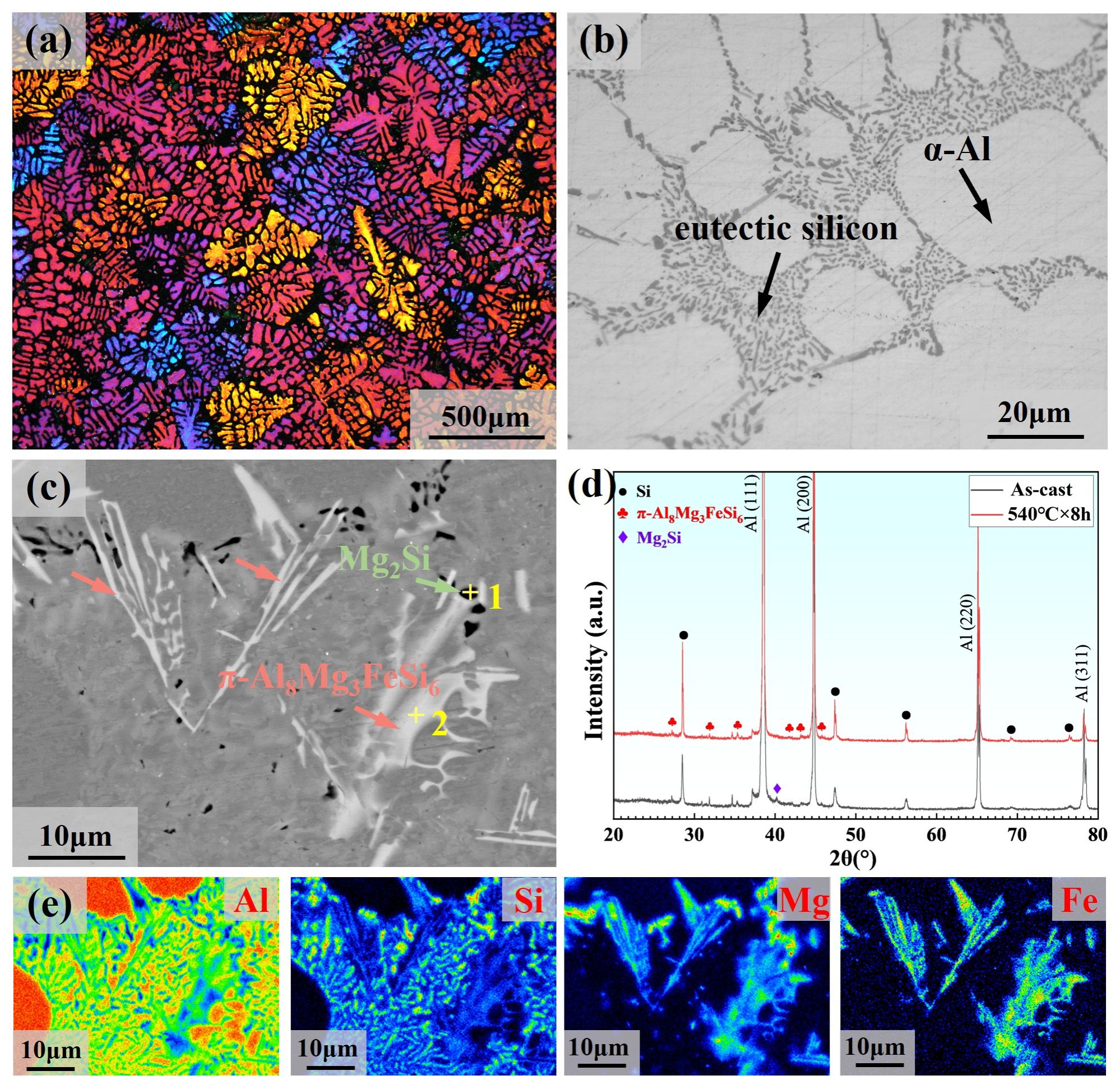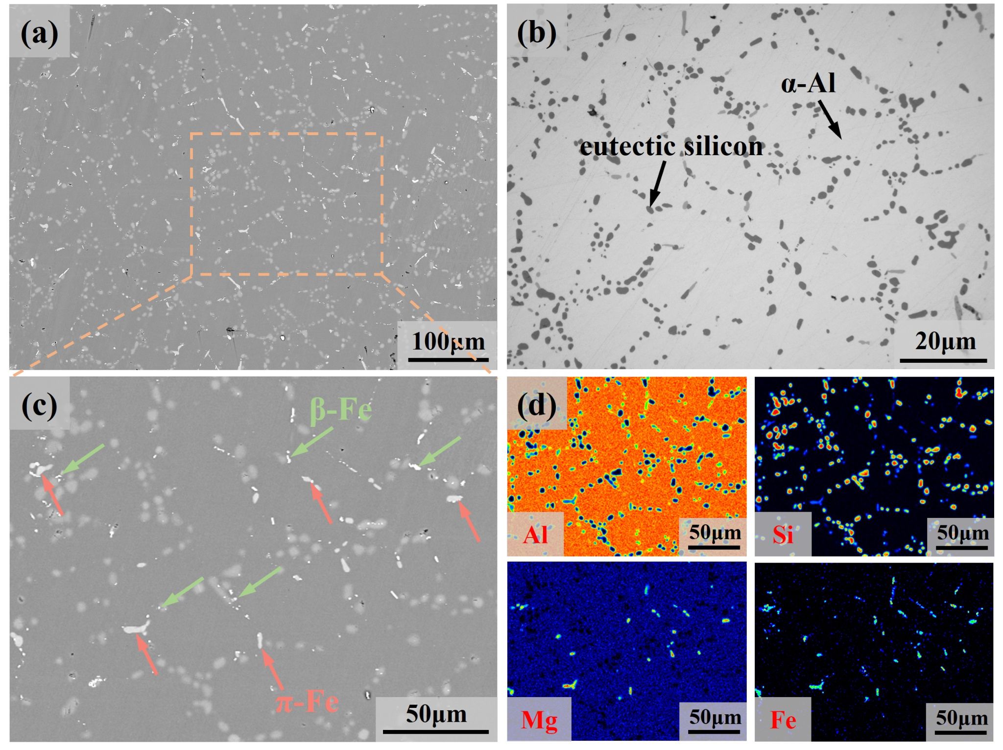 Al-Si-Mg系铸造铝合金因其优异的铸造性能和耐腐蚀性能而广泛应用于汽车和航空航天领域。然而,铁作为铝合金铸件生产过程中不可避免的杂质元素之一,其在铝中的最大溶解度仅为0.05 wt.%,极易与其他元素形成粗大的脆性金属间化合物(主要是π-Fe相—Al8Mg3FeSi6),严重降低合金的综合力学性能。因此,有害π-Fe相的调控成为了全面提升材料性能的关键。