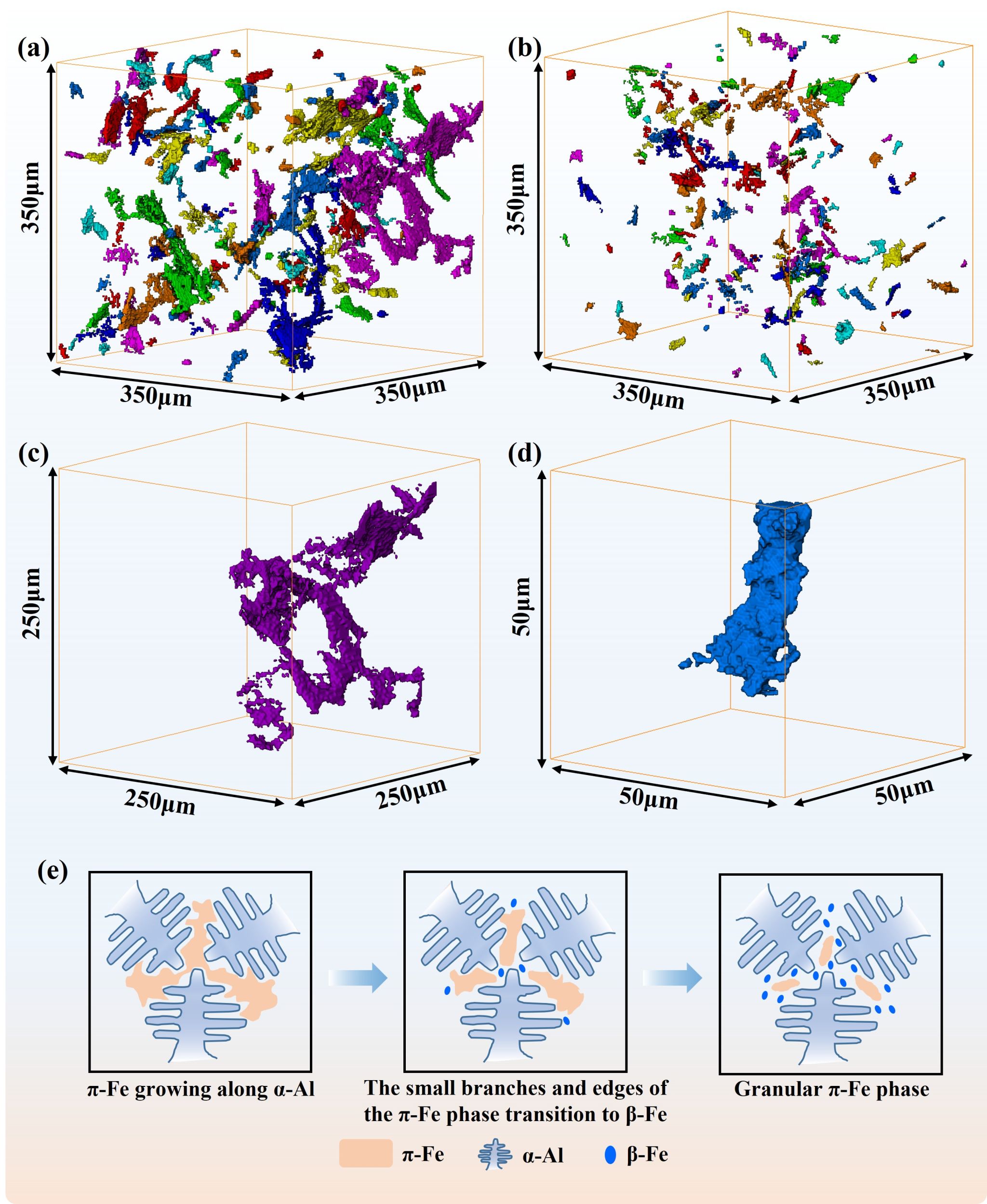 图6 不同固溶处理后合金中π-Fe相的三维形貌及其转变示意图:(a, c) 540°C × 12h;(b, d) 540°C × 8h + 560°C × 4h;(e) π-Fe相的转变示意图