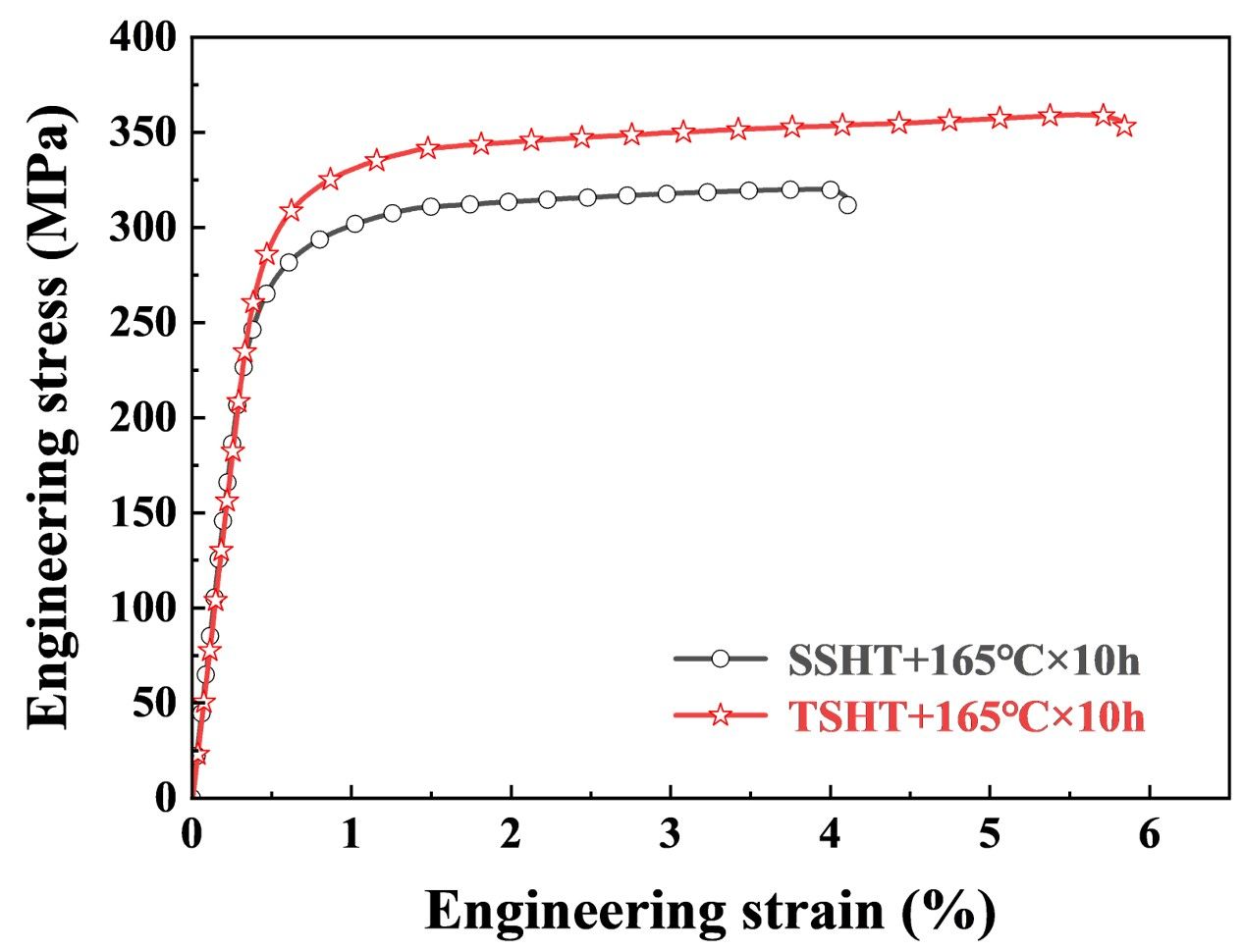 大连理工大学“辽宁省凝固控制与数字化制备技术重点实验室”科研人员以高Mg含量的Al-7Si-0.6Mg合金为研究对象,首先分析了其在传统单级固溶处理过程中微观组织的变化。结果表明,在低温(540℃)固溶处理条件下,即使固溶时间长达20 h,组织中的π-Fe相仍保持粗大的汉字状形态(图1和图2);560℃高温固溶可将粗大汉字状π-Fe相转变成细小颗粒状β-Fe颗粒(图3),但是组织发生过烧。因此,简单的单级固溶处理难以有效调控π-Fe相。基于铸态及固溶态合金热稳定性(图4)研究,研究团队提出了两段式固溶处理的策略(540℃ × 8 h + 560℃ × 4 h);在实现π-Fe相形貌控制的同时,避免组织的过烧风险(图5)。研究中首次观察到铸态组织中π-Fe相的三维空间形貌,其粗大的分支结构严重分割α-Al晶粒;经两段式的双级固溶处理后,π-Fe相形态由连续网状转变为颗粒状(图6)。这种显微组织的优化使合金获得强度与延展性的同步提升,突破了传统材料“强度-韧性权衡”的瓶颈(图7)。该策略为Al-Si-Mg合金的性能优化提供了可直接产业化的处理工艺,其“分步调控”的研究思路也为其他多相合金体系的组织调控设计提供了重要借鉴。