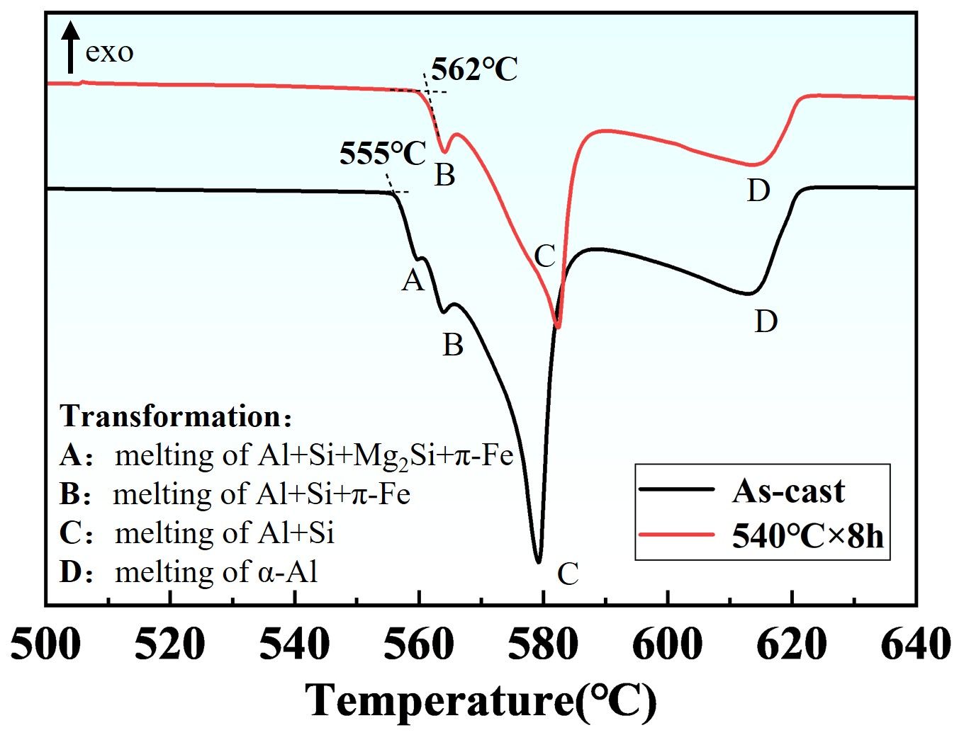 图4 铸态合金及其经540°C固溶处理8h后的DSC曲线