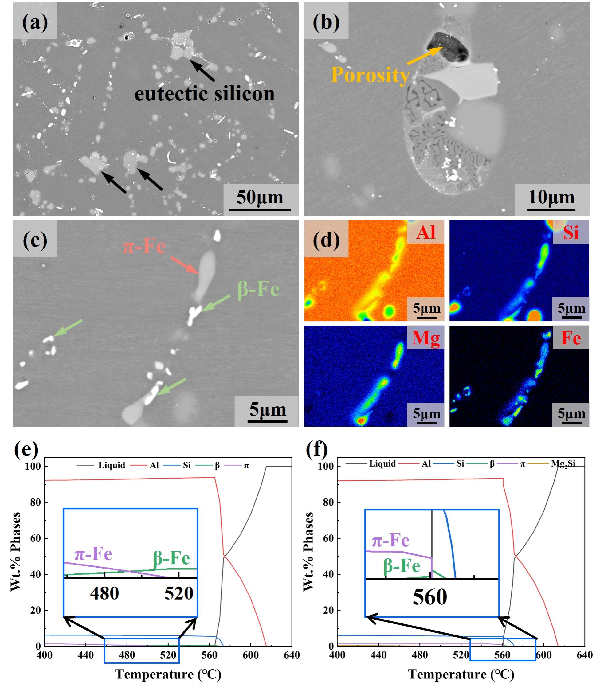 图3 560℃固溶处理2h后合金的显微组织:(a) 异常长大的共晶硅;(b) 复熔球;(c) π-Fe向β-Fe的转变;(d) c图的EPMA面分析;及不同Mg含量合金的相稳定性分析:(e) Al-7Si-0.3Mg-0.15Fe;(f) Al-7Si-0.6Mg-0.15Fe